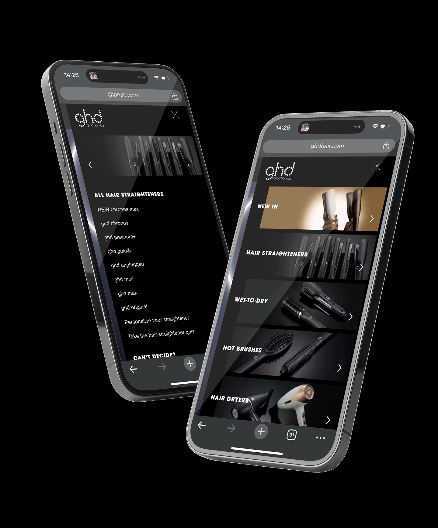 The new design introduced simplified categories for easier navigation, while highlighting key ghd products in dedicated sections. The updated menu also incorporated interactive elements.